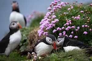 An intimate moment between puffins on a beautiful spring day in the Treshnish Isles, Scotland.
